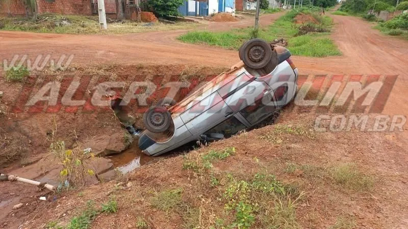 Na manhã deste domingo, 28, um veículo modelo Fiat Uno foi encontrado capotado dentro de uma vala no cruzamento da Rua Jamari com Avenida Niterói, no bairro Planalto, em Rolim de Moura (RO).